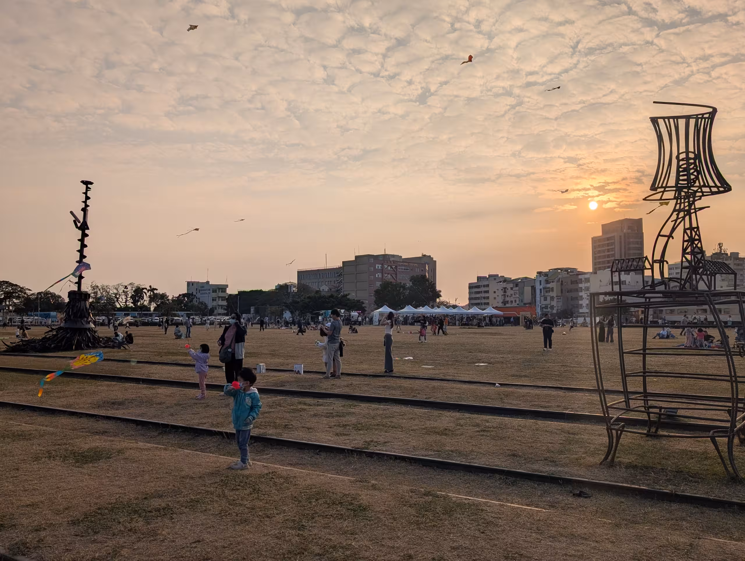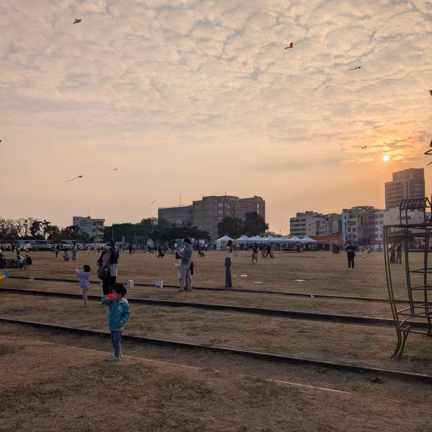 Full of families having picnic and playing kites.